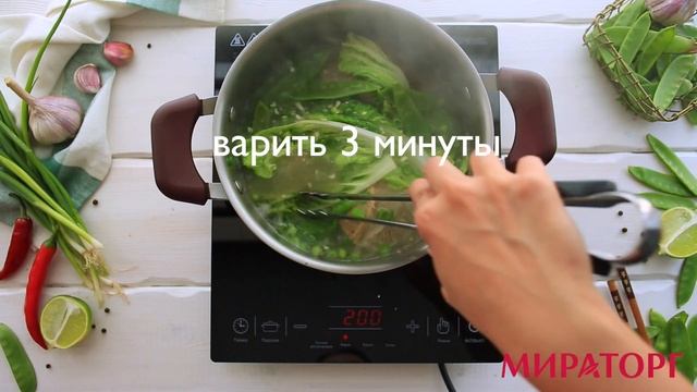Ингредиенты: Ребрышки от “Мираторга” – 300 грамм; Зеленый лук – 4 шт; Чеснок – 2 зубчика; Чили – 2 стручка; Кинза – ½ пучка; Бок чой или китайская капуста – 150 грамм; Зеленый горошек – 70 грамм; Рисовая вермишель – 150 грамм; Лайм – ½ шт; Соевый соус – 50 мл.