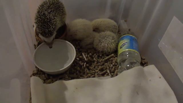 Ежиха с маленькими ежатами, пьет воду и ест кошачий корм