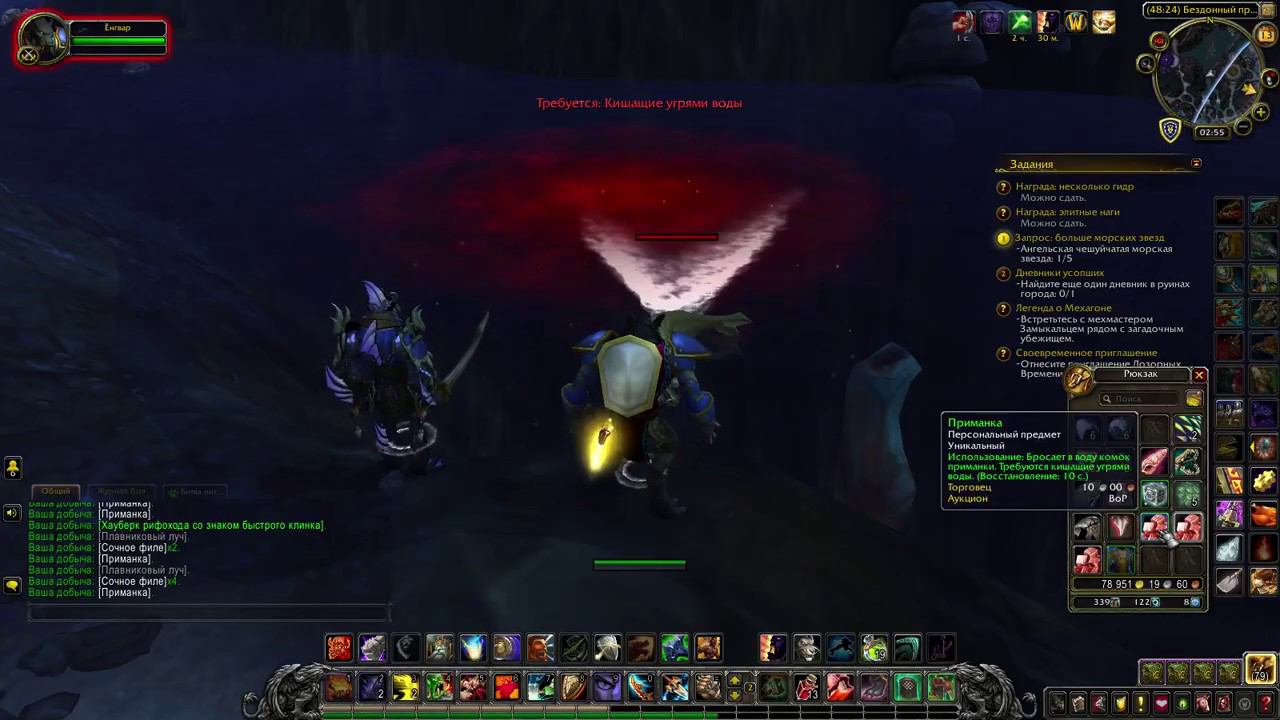Рутуб Основная Активность Теперь Там Если не Сложно Подпишись Пожалуйста на Мой Канал https://rutube.ru/channel/24213753/ Для того, чтобы использовать Приманка , Вам необходимо находиться в локации Назжатар по координатам /way 48.39, 24.16 рядом с лункой Полная инфа тут http://catcut.net/cI2M Кишащие угрями воды. При неоднократном закидывании приманки в вводу, может появиться рарник Вор'кот с которого может выпасть Радужная манажемчужина. Дорогой зритель если моё видео тебе понравилось поставь лайк или подпишись на канал,для меня это лучшая благодарность. Координаты вы можете наблюдать верхнем правом углу экрана над мини картой. #wow#qwest#world_of_warcraft