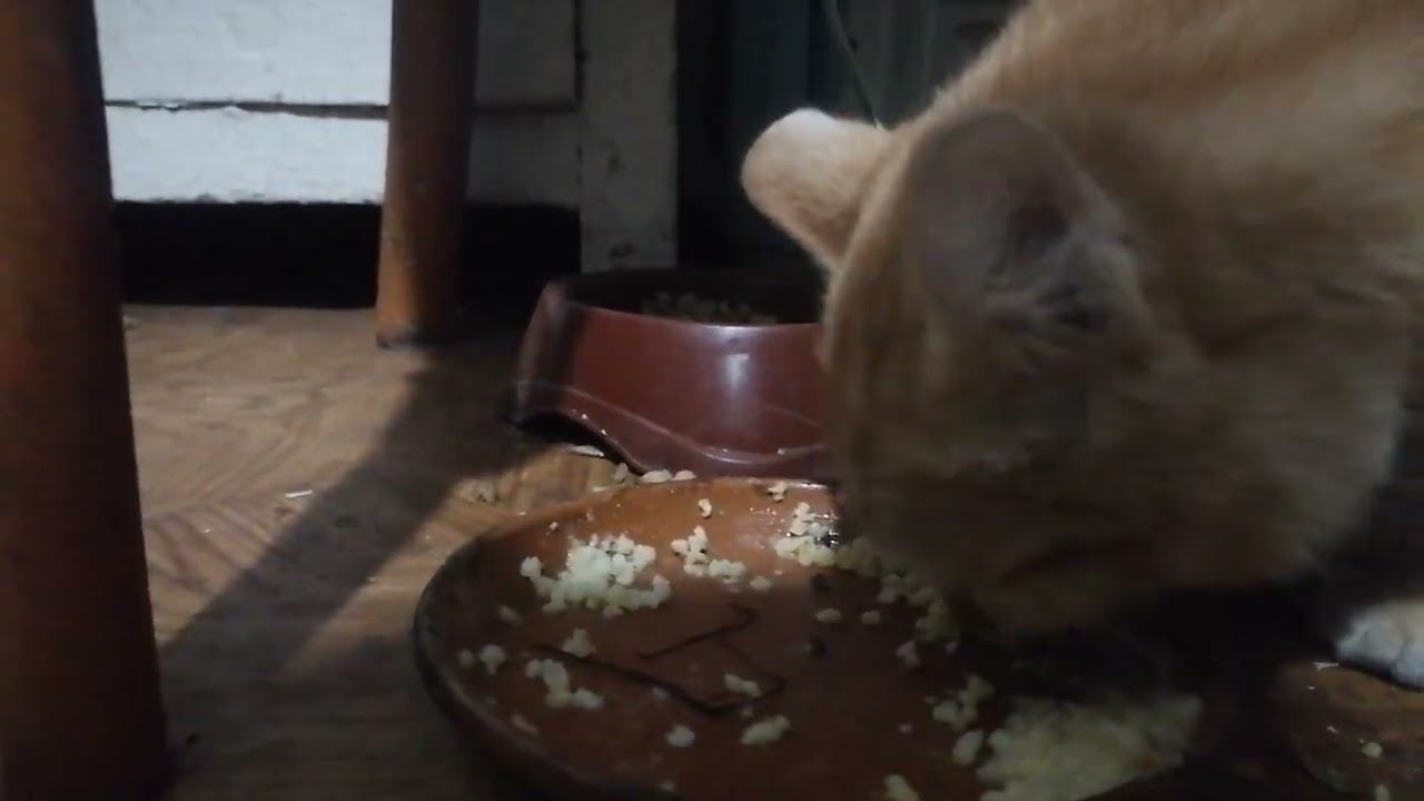 деревня рыжыи кот ест из тарелки
