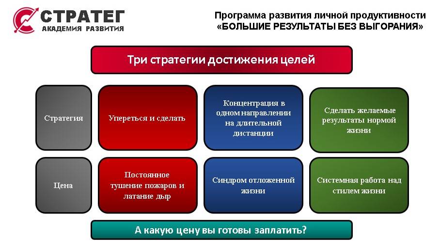 Академия развития "СТРАТЕГ" 21 октября 2024 Поддерживающая встреча 004 БРВ-4 Поддерживающая встреча по освоению системы формирования высокопродуктивного стиля жизни "Большие результаты без выгорания" ("БРВ"). БРВ-4 - 4 версия системы формирования высокопродуктивного стиля жизни "БРВ". Постановка целе и 4 категории целей. Три стратегии достижения целей - цена, которую необходимо заплатить.