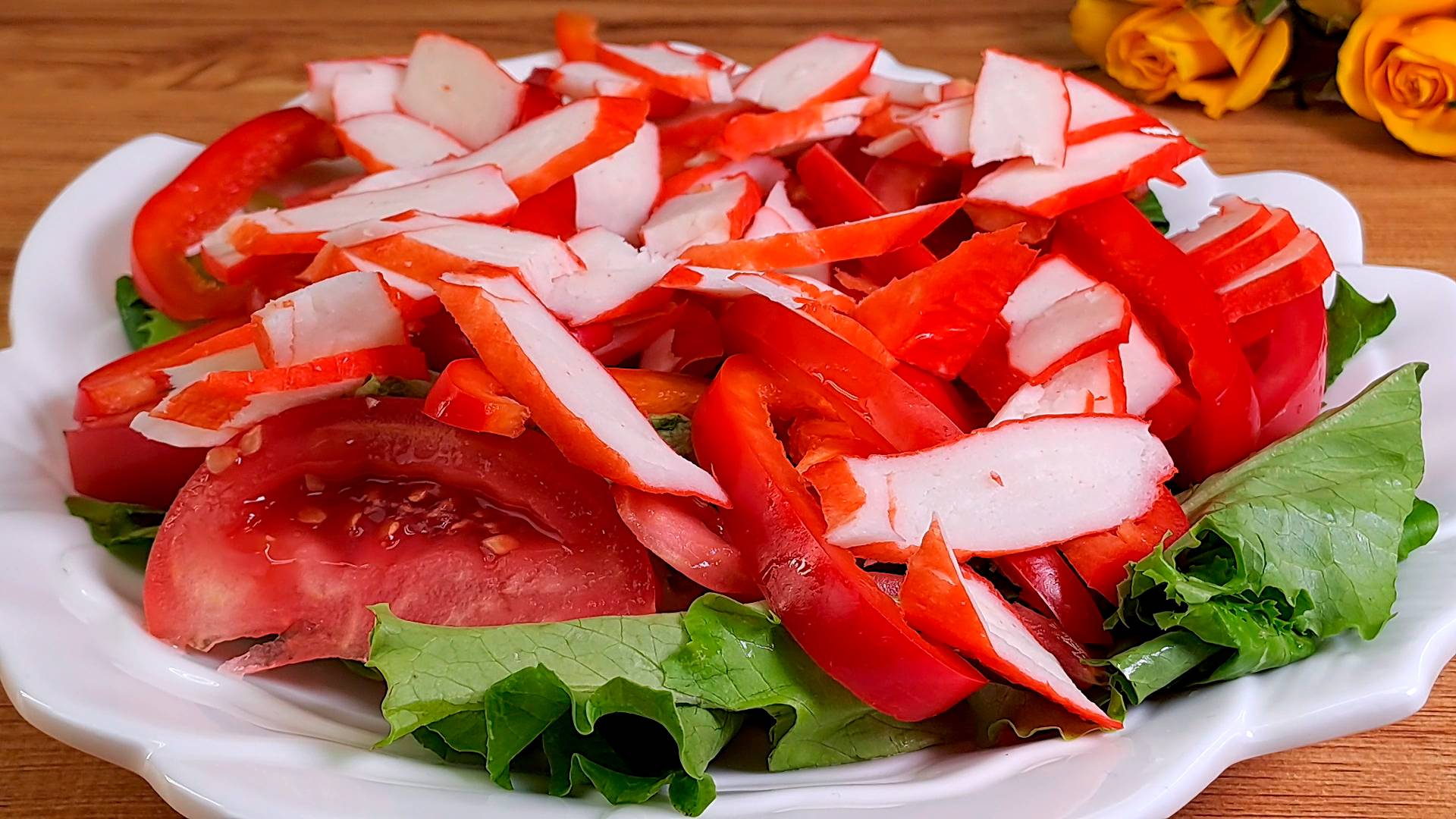 Ингредиенты салата: листья салата. 1 помидор. 1 красный болгарский перец. 100 грамм крабовых палочек. зеленый лук. укроп. соль, черный перец. 40 грамм майонеза. Подписывайся на канал и делись видео с друзьями. Также у меня на канале еще очень много вкусных рецептов, и еще больше рецептов ждет вас впереди. Вконтакте - https://vk.com/vkusnierecipe Одноклассники - https://ok.ru/group/70000000861442 Дзен - https://dzen.ru/vkusnierecipes https://dzen.ru/isrecipe Весь музыкальный контент, использующийся в видео на данном канале размещён на основании лицензии Creative Commons 4.0 вариант лицензии CC0 (https://creativecommons.org/licenses/by/4.0/) с медиатеки, где не требуется указания авторства.