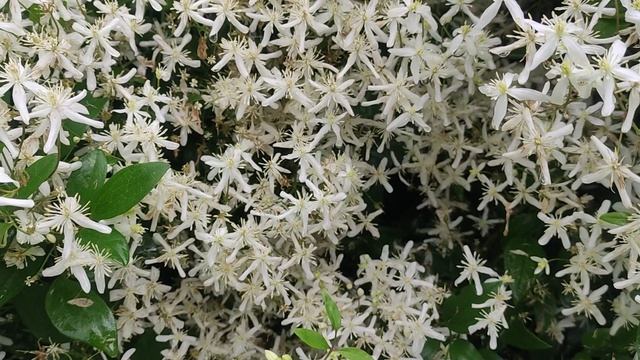 Цветение мелкоцветкового клематиса. Белый клематис. Цветение хосты.