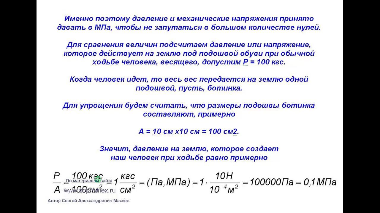 https://sopromex.ru/ - официальный сайт онлайн университета проф. Макеева С.А. На практическом примере дано представление о величине давления в 1 Па. Показано какое давление создает обычный человек при ходьбе по Земле. http://www.youtube.com/watch?v=49lTE7HqTR8