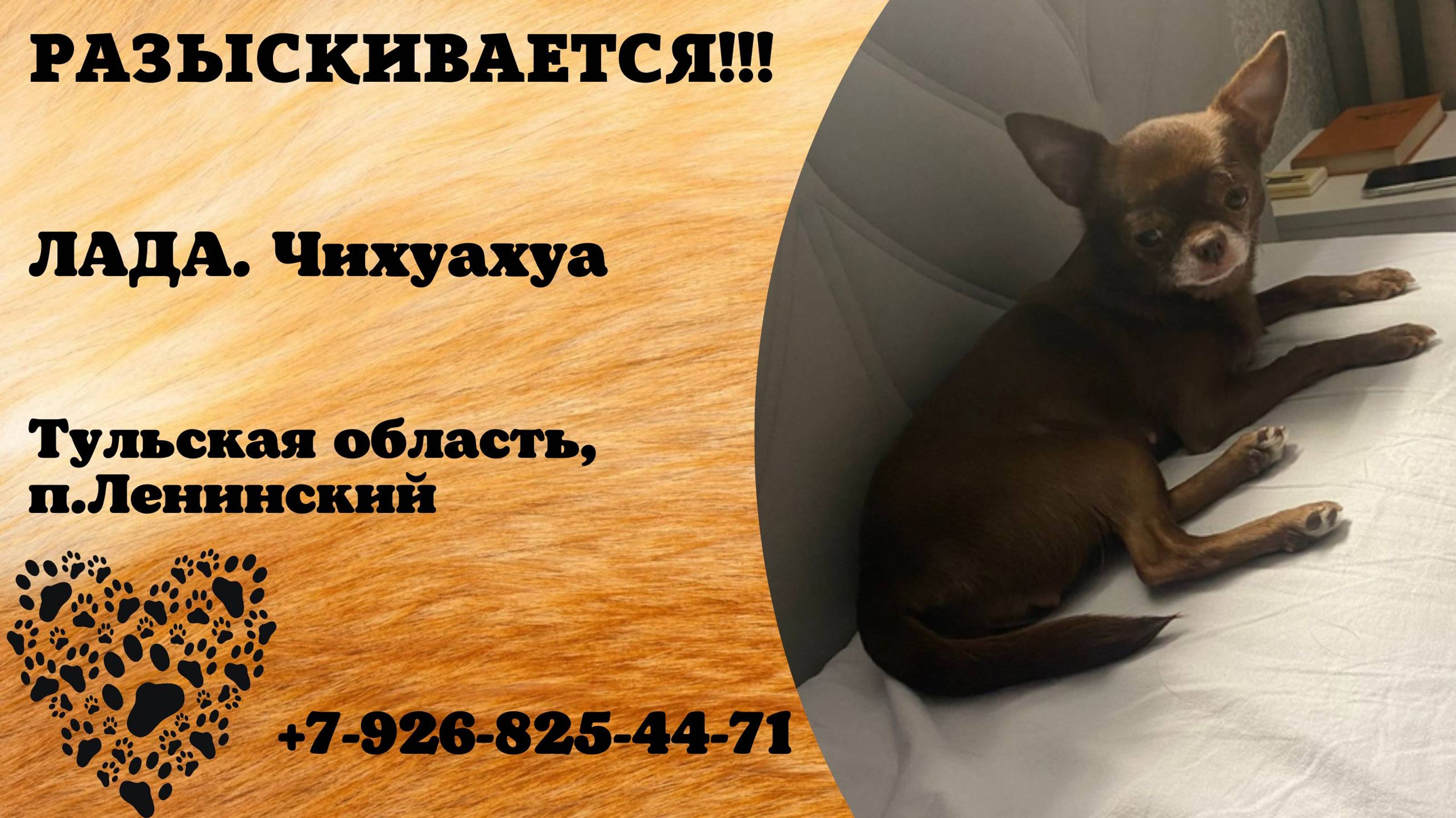 Тульская п.Ленинский Пропала чихуахуа 10 августа пос Ленинский Тульская область. Чихуахуа Лада, боится, в руки не идет. Нужно выловить и придержать. Собака бывшеприютская. +79268254471 Автор: https://vk.com/absolutniy_stalevar Инфо: https://vk.com/wall-198815410_148806