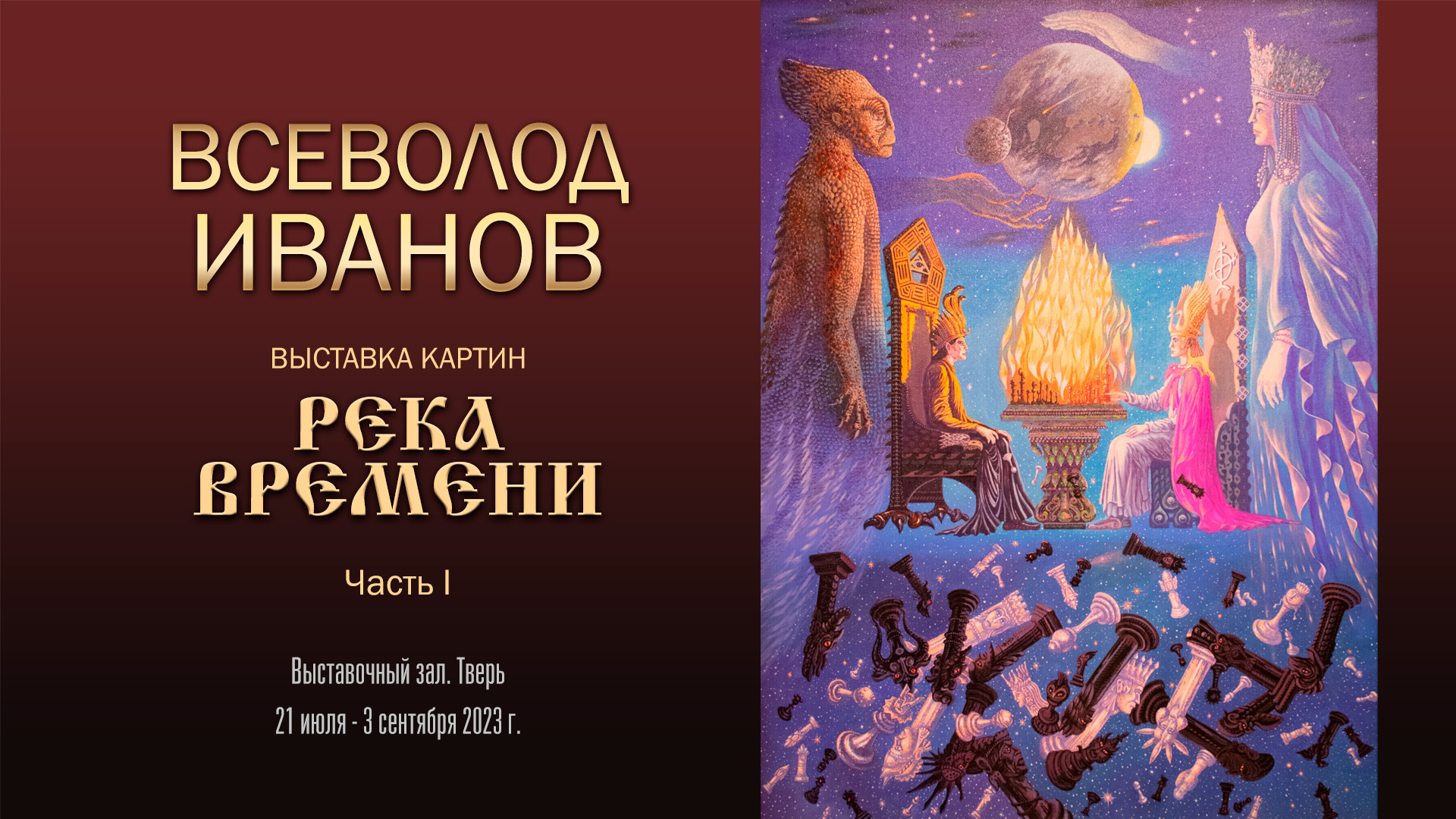 На персональной выставке «Река времени» представлены одни из самых узнаваемых произведений художника-славяниста ВСЕВОЛОДА ИВАНОВА. Основная часть работ посвящена тайнам ушедших цивилизаций: Атлантиде и Гиперборее. Творчество этого неординарного живописца популярно по всей России и в мире. Уникальные работы Всеволода Иванова широко растиражированы в Интернете, они украшают книги, их можно увидеть в различных программах федеральных телеканалов. Выставка «Река времени»: 21 июля – 3 сентября 2023 г. Выставочный зал. Тверь Дата съемки: 27 июля 2023 г.
