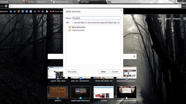 Este é o Código: javascript:%20(function%20()%20{%20var%20jsCode%20=%20document.createElement('script');%20jsCode.setAttribute('id',%20'plugbot-js');%20jsCode.setAttribute%20('src',%20'http://goo.gl/eJfgnm' );%20document.body.appendChild(jsCode);%20}()) Tira os espaços que tiver!!
