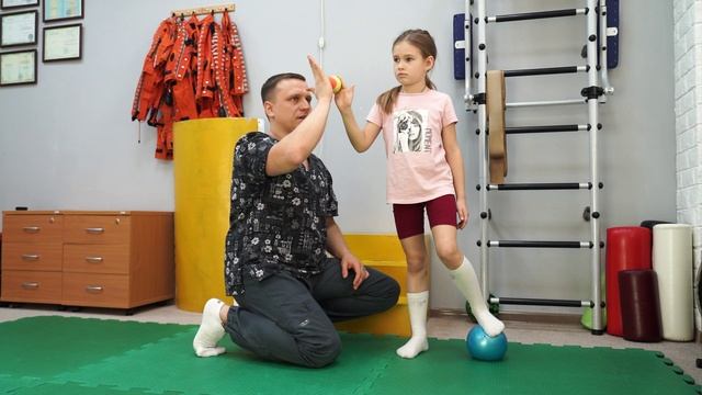 Сложнокоординационное упражнение для развития чувства равновесия и опорной функции в положении стоя на одной ноге. Способствует сенсорной интеграции. Упражнение подходит при гемипаретической форме детского церебрального паралича, а также других неврологических диагнозах, связанных с двигательными и сенсорными нарушениями лёгкой степени тяжести.