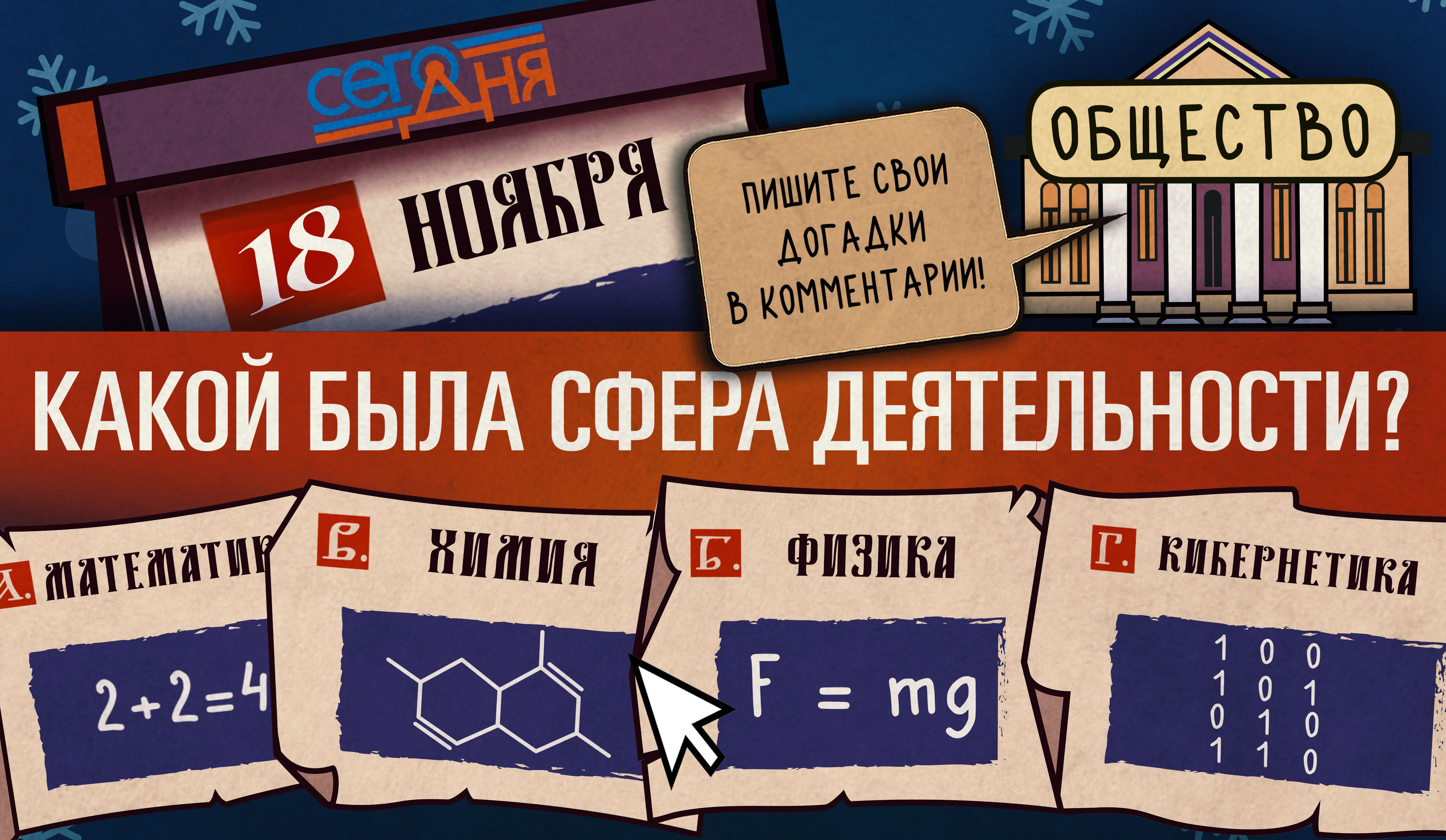 А вы уже готовитесь к Новому Году? Письмо Деду Морозу написали? А уже пора — ведь до зимы осталось всего ничего. Сегодня, например, день рождения Деда Мороза! Какой была сфера деятельности одного русского общества, основанного 18 ноября 1868 года? Отгадай, что случилось «Сего дня»!