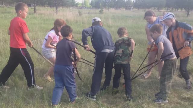 Играем в хоккей палками на траве.