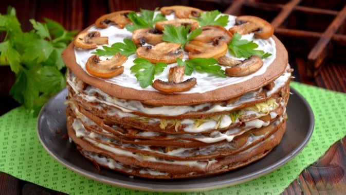 Частый гость на праздничном столе. ПЕЧЁНОЧНЫЙ ТОРТ С ГРИБАМИ И СЫРОМ