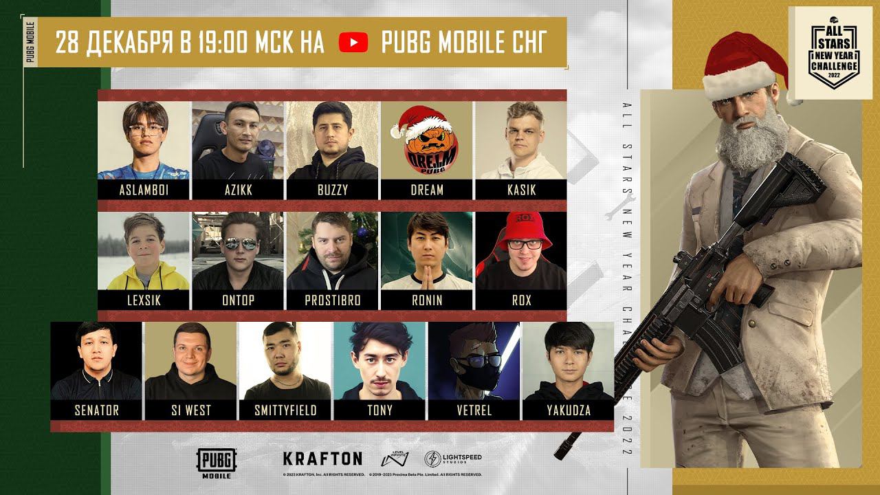 28 декабря, в 19:00 по мск на официальном YouTube-канале PUBG MOBILE СНГ – пройдёт ALL STARS NEW YEAR CHALLENGE 2022! Стримеры, совместно со своими командами, вступят в борьбу не только за звание победителя, но и за призовой фонд в размере 103.200 UC! Поэтому, не пропустите анонс стрима, а также поддержите своего фаворита в комментариях. #PUBGMOBILE #PUBGM #ALLSTARS Следи за нами в социальных сетях: ВКонтакте: https://vk.com/pubgmobile YouTube: https://www.youtube.com/c/pubgmobile_cis Instagram: https://www.instagram.com/pubgmcis/ Telegram: https://t.me/official_pubgmobile_ru TikTok: https://www.tiktok.com/@pubgmobilecis