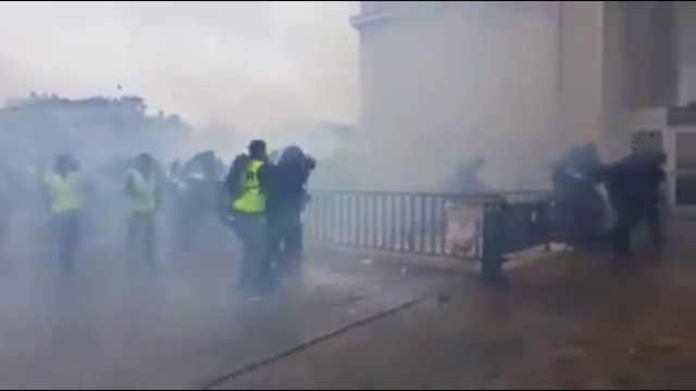 Place de l'Étoile à Paris ce samedi 1er décembre, où un CRS tombé à terre a été frappé par des manifestants portant des gilets jaunes.