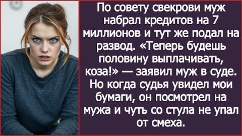 ИСТОРИИ ИЗ ЖИЗНИ/По совету свекрови муж набрал кредитов на 7 миллионов и тут же подал на развод