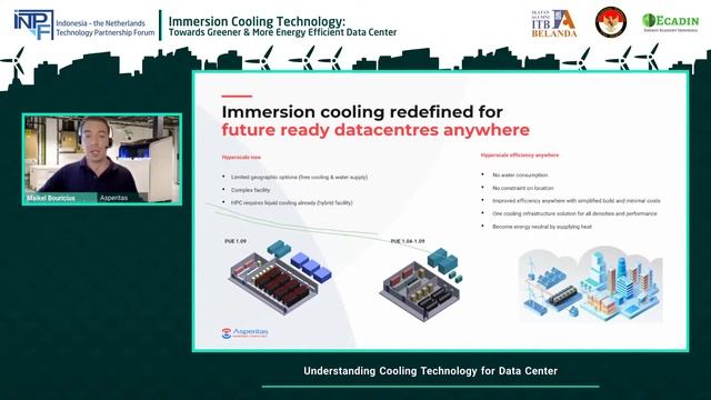 In 2021 to-date, global data center market has grown 18.30% compared to last year, and is expected to accelerate its growth at about 21% CAGR. On the other hand, 43% of the electricity used to operate these data centers are coming from the necessary cooling process for the data center itself. Knowing the imminent growth of these servers, how can The Netherlands optimise the electricity usage, particularly coming from the cooling which, at the moment, accounts for almost half of the electricity required to power a data center and make the data center growth more sustainable and to what extend the technology is also applicable to be implemented in Indonesia? Bandung Institute of Technology Alumni Network - Netherlands Chapter (IA-ITB Netherlands), and the Embassy of the Republic of Indonesia in The Hague (KBRI Den Haag), in collaboration with Energy Academy Indonesia (ECADIN) invite you to join the 4th Webinar Series of Indonesia – the Netherlands Technology Partnership Forum (INTPF) 2021. The topic of this webinar: Immersion Cooling Technology: Towards Greener and More Energy Efficient Data Center. This event will be held on Saturday, 11 September 2021, 10-12 CEST/ 15-17 WIB. Free registration: partnership.iaitb.nl Keynote*: Dadan Kusdiana, Director General New Energy, Renewable, and Energy Conservation, Ministry of Energy and Mineral Resources, Republic of Indonesia. *to be confirmed Speakers: 1. Marco Cioffi, Director of Operations, PT DCI Indonesia (Tbk). 2. Maikel Bouricius, Business Development Manager, Asperitas. 3. Patrick Chan, Vice President of South Asia, Uptime Institute. Moderator: Muhamad Faris Naufal Austen - Data Center Specialist #INTPF #IAITBNL https://linktr.ee/iaitbnl #KBRI_DenHaag #ECADIN ecadin.org