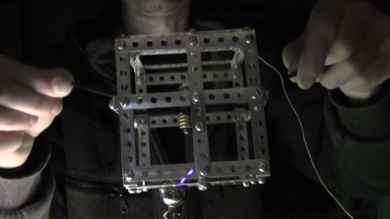 Взаимодействие качера и клетки Фарадея. Внутри клетки Фарадея неоновая лампочка, которая регистрирует наличие поля.