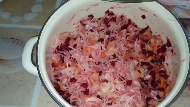Ингредиенты: 350 грамм квашеной капусты 4 средних картофеля 4 средние свёклы 4 небольшие моркови 3 средних маринованных огурцов 1 средний репчатый лук (можно красный) Зелень (кинза, укроп, петрушка) 340 грамм (1 банка) Консервированной красной фасоли. 70-80 грамм растительного масла (лучше использовать оливковое или подсолнечное)