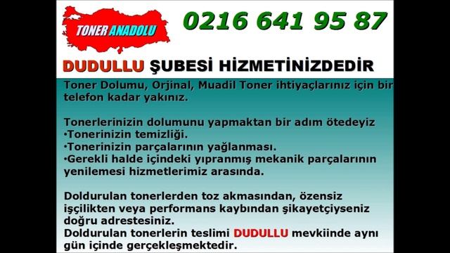 http://toneranadolu.com 0216 641 95 87 Toner Dolumu, Orjinal, Muadil Toner ihtiyaçlarınız için bir telefon kadar yakınız. Tonerlerinizin dolumunu yapmaktan bir adım ötedeyiz Tonerinizin temizliği. Tonerinizin parçalarının yağlanması. Gerekli halde içindeki yıpranmış mekanik parçalarının yenilemesi hizmetlerimiz arasında. Doldurulan tonerlerden toz akmasından, özensiz işçilikten veya performans kaybından şikayetçiyseniz doğru adrestesiniz. Doldurulan tonerlerin teslimi DUDULLU mevkiinde aynı gün içinde gerçekleşmektedir.