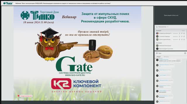Российский бренд СКУД Gate - это бренд технологической сферы контроля доступа, который включает в себя отечественные продукты и технологии. Основополагающим принципом Gate является развитие системы, которая должна быть простой и удобной для специалистов и инсталляторов, недорогой и понятной в эксплуатации для пользователей. АО «Хакель» - российский производитель электротехнической продукции. Более 20 лет является разработчиком и производителем устройств защиты от импульсных перенапряжений (УЗИП), компонентов молниезащиты и заземления, промышленной автоматики (релейные модули, блоки питания и прочее), электронных компонентов (оксидно-цинковые варисторы). Программа вебинара Классическая структура СКУД и опыт эксплуатации в условиях импульсных помех (ИП). Перечень основных интерфейсов и иных точек уязвимости от различных источников импульсных помех. Внешние проявления последствий воздействия ИП. цепь питания контроллеров и исполнительных устройств интерфейсы для подключения считывателей популярных идентификаторов сетевые интерфейсы: Erternet и RS-485 Общая теория грозозащиты и защиты от ИП электронных приборов и сетей. Рекомендации по защите от ИП базовых интерфейсов СКУД. Вебинар проводили: 1,2 вопросы - заместитель генерального директора по работе с клиентами бренда Gate Кондратьев Евгений Рудольфович 3,4 вопросы - ведущий инженер АО «Хакель» Шамсутдинов Игорь Фархатович