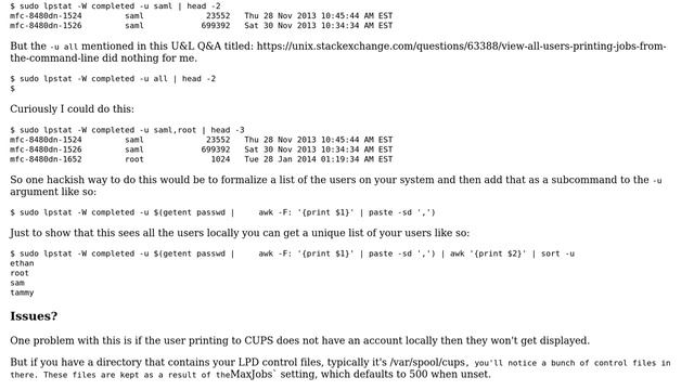 Unix & Linux: How to show the CUPS printer jobs history? (4 Solutions!) Helpful? Please support me on Patreon: https://www.patreon.com/roelvandepaar With thanks & praise to God, and with thanks to the many people who have made this project possible! | Content (except music & images) licensed under cc by-sa 3.0 | Music: https://www.bensound.com/royalty-free-music | Images: https://stocksnap.io/license & others | With thanks to user slm (https://unix.stackexchange.com/users/7453), user Santiago (https://unix.stackexchange.com/users/64622), user Kurt Pfeifle (https://unix.stackexchange.com/users/7555), user HalosGhost (https://unix.stackexchange.com/users/65525), user Faheem Mitha (https://unix.stackexchange.com/users/4671), user Alexis-Emmanuel Haeringer (https://unix.stackexchange.com/users/78132), and the Stack Exchange Network (http://unix.stackexchange.com/questions/123634). Trademarks are property of their respective owners. Disclaimer: All information is provided "AS IS" without warranty of any kind. You are responsible for your own actions. Please contact me if anything is amiss at Roel D.OT VandePaar A.T gmail.com.