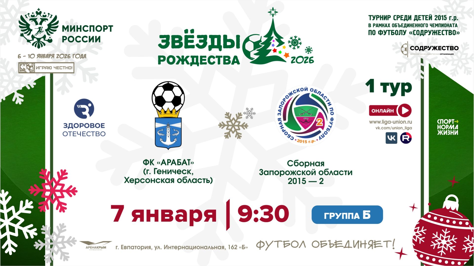 1 ТУР [Б] |ФК «Арабат» (г. Геническ, Херсонская область) - Сборная Запорожской области-2 2015 г.р. | 7.01.2026 | 09:30