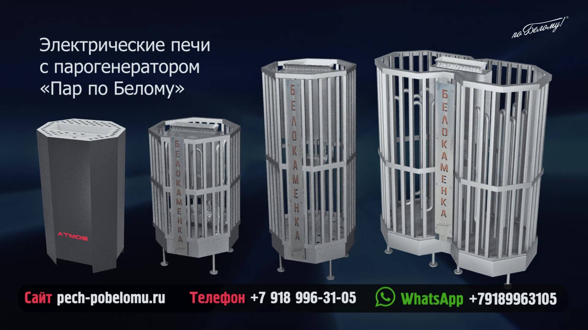Наша новая разработка электрический парогенератор "Пар по Белому". Установленный в любую из печей каменок "Белокаменка" выдает качественный пар как в настоящей русской бане. Так же есть отдельное решение - ATMOS со встроенным парогенератором. Официальный сайт: pech-pobelomu.ru. Телефон +7 (918) 485-42-63, WhatsApp +7 (918) 996-31-05.
