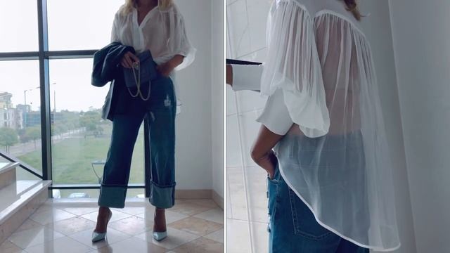 Блуза превзошла всякого ожидания, сколько в ней нежности. Стильные, прямого кроя джинсы с высоким отворотом и лодочки на каблуке. Очки, жакет и сумка придают образу неуловимый суперлатив
