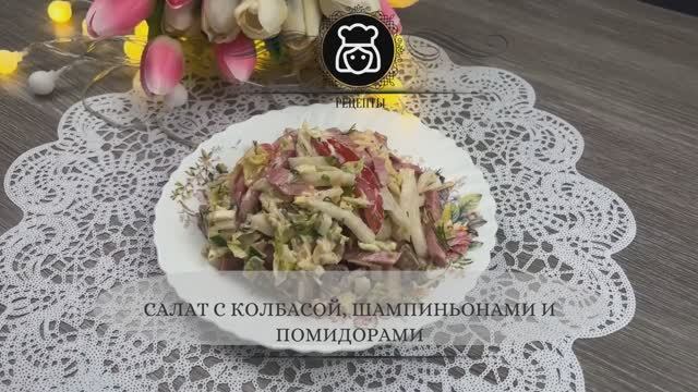 Салат с колбасой, шампиньонами и помидорами