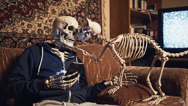 Пример промта veo3 залитой в чат попробуй https://t.me/SnapToVideo_bot Типичная Российская квартира герой говорит на русском языке, Реалистичное видео, снятое на ручную камеру, на котором показаны только скелеты — полностью обнажённые костные структуры как у людей, так и у животных. Скелет в толстовке с капюшоном и спортивных штанах лежит на диване, его костлявые руки листают что-то в телефоне. Рядом с ним свернулся калачиком маленький скелет кошки, аккуратно поджав свой тонкий костлявый хвост. Её пустые глазницы неподвижно смотрят в пустоту. В комнате тихо, если не считать тихого гула телевизора на заднем плане. Скелет рассеянно протягивает руку и гладит голый кошачий череп, слегка постукивая фалангами по черепной коробке. Кошка-скелет внезапно поднимает голову и поворачивает пустые глазницы к своему хозяину. Наступает тишина. Затем кошка поднимает полностью костяную лапу и легонько бьёт ею по руке скелета. Раздаётся тихий стук костей о кости. Скелет замирает, его пальцы неподвижны. Кошка остаётся неподвижной, её пустые глазницы не моргают. Затем, с нарочитой точностью, кошка встаёт, потягивается и резко отворачивается, взмахнув своим костлявым хвостом. Скелет вздыхает и возвращается к прокрутке.