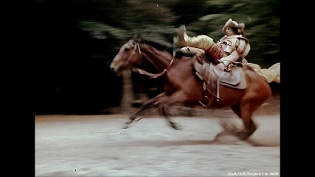 Дулёр Портоса- Анатолий Ходюшин не смог сделать заданный мною в этом эпизоде трюк "подсечка лошади",потерял равновесие,выпустил из рук штрабат и грохнулся под ноги лошади,которая врезала ему копытом по голове и чуть не убила...Две недели провалялся А.Ходюшин в больнице с сотрясением и отёком мозга....а потом вышел и начал говрить, что все конные трюки поставил в фильме он....Второй режиссёр Таня Чернова ,после того ,как А.Ходюшин грохнулся с конём на пол таверны ,прыгая в окно за Атоса ...сжалилась и написала совершенно не законно фамилию А.Ходюшина в титры - конные трюки и драки. В смысле он исполнял конные трюки и драки...Постановщиком трюков,при том,главным и единственным на фильме "Д*Артаньян и три мушкетёра был и остаётся -Николай Ващилин. Смотрите интервью с режиссёром Георгием Юнгвальд-Хильквичем...http://rutube.ru/video/90a35f6da482116588198f8f4abc09ab/
