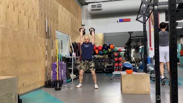 Взятие с виса+швунг 2 гирь (толчок по длинному циклу)