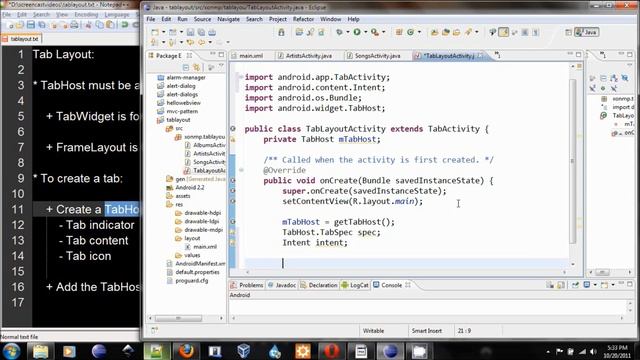 Simple tutorial for setting up the tab layout in Android application. This tutorial uses the example of Google documentation about Tab Layout http://developer.android.com/resources/tutorials/views/hello-tabwidget.html If you have any questions or comments, please leave them below.