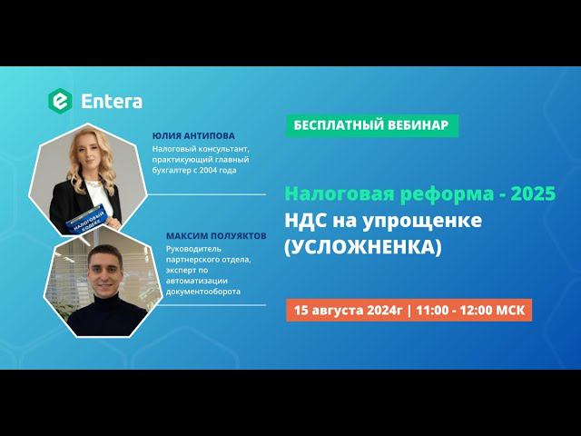 Наши эксперты раскрыли, как избежать ошибок при уплате НДС на УСН в 2025! Юлия Антипова - налоговый консультант и практикующий главный бухгалтер подробно рассказала про: ✅ Основные направления налоговой реформы. ✅ Лимиты по УСН с 2025 года. ✅ УСН и НДС: ставки и лимиты. ✅ Обязанности упрощенцев с 2025 года. ✅ Варианты уплаты НДС: кто может перейти на ОСНО? ✅ Общие рекомендации: что нужно сделать бизнесу в текущем году? Максим Полуяктов - эксперт в области автоматизации документооборота. Спикер поделился, как подготовиться к изменениям в налоговой реформе с сервисом для ввода первичных документов. Хотите узнать, когда будет следующий вебинар? Подписывайтесь на рассылку анонсов: https://entera.pro/webinary #бухгалтерскиеуслуги #бухгалтерскийучет #бухгалтерскоеобслуживание #бухучет #аутсорс #ведениебухгалтерскогоучета #бухгалтерудаленно #бухгалтерскаякомпания #аутсорсингбухгалтерскихуслуг #entera #энтера #автоматизацияпервички #автоматизациябизнеса #автоматизация1с #автоматизацияпервички #распознаваниепервички #сервисавтоматизации #бухгалтеру #авансовыйотчет #вводчековв1с #чекив1с #приложение1с