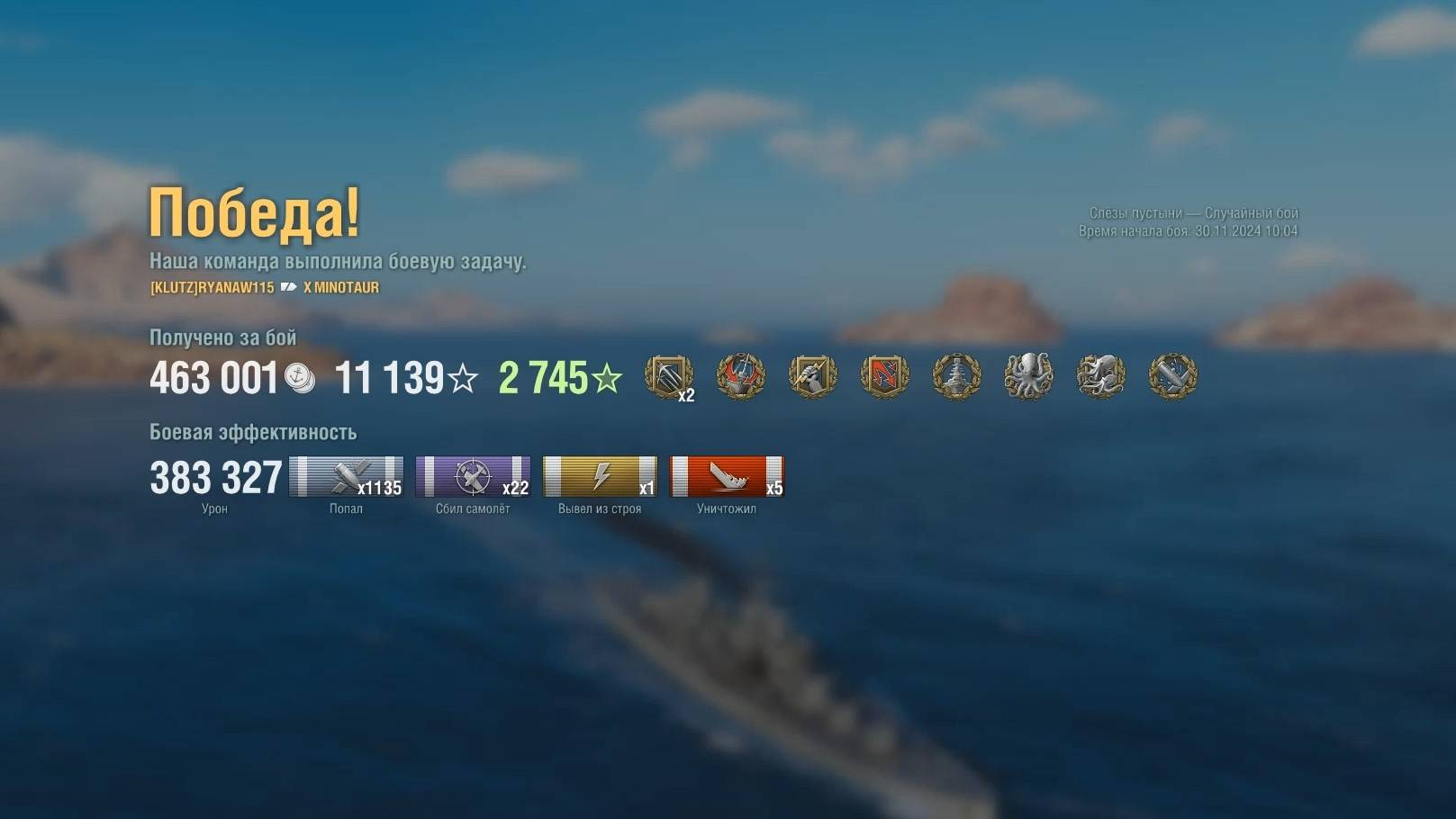 Крейсер Minotaur. Игрок: RYANAW115 (NA). Карта: Слёзы пустыни - Случайный бой. Урон: 383к. Minotaur - Крейсер Британии 10 уровня.