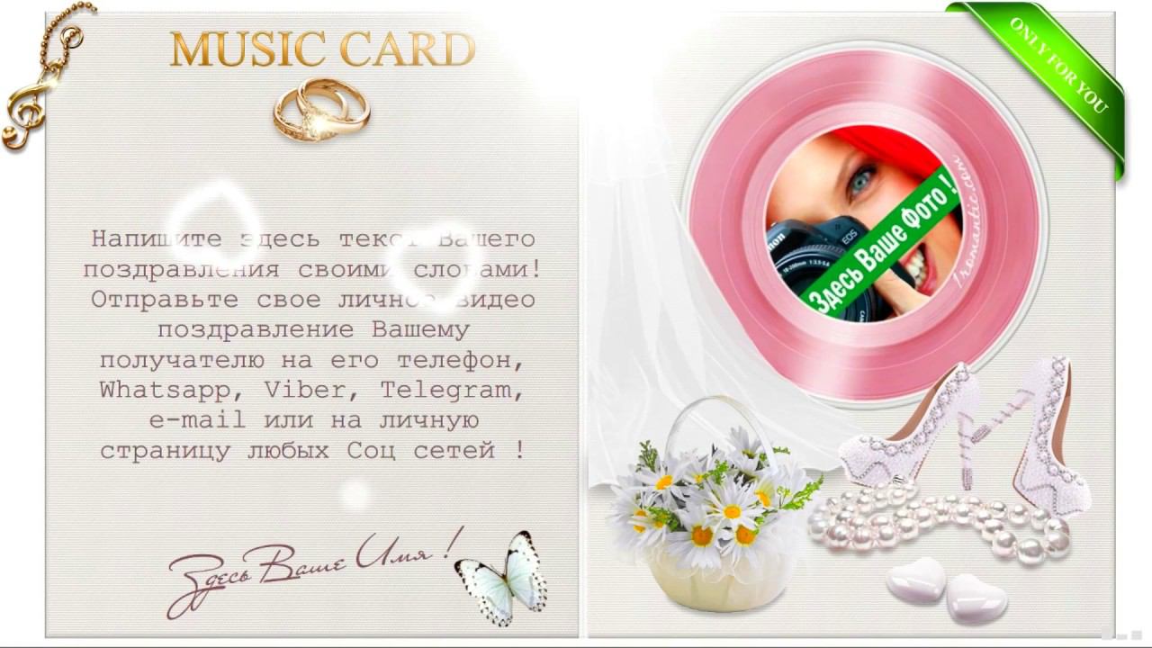 ЗАПОЛНИТЬ ЭТО ПОЗДРАВЛЕНИЕ СВОИМИ СЛОВАМИ (установите нужную дату и время доставки для своего получателя) : Здесь ➞ https://1romantic.com/musicalnye-pozdravleniya/samoe-krasivoe-priglashenie-na-svadbu/ Вам остаётся только, написать нужный вам текст и загрузить фото, свою или Вашего получателя. 1Romantic.com Является первым и единственным в мире сервисом интерактивных видео поздравлений. Мы используем собственную уникальную технологию, добавляя ежедневно самые новые и последние разработки программирования. У нас Вы можете найти поздравления на любой вкус, только высокого качества и разрешения. Согласитесь, всегда приятней, отправить поздравления от себя лично, чем пересылать чужие, с уже заготовленным стандартным и быстро мерцающим текстом, как рекламный баннер, пересылаемый друг-другу от тысячи к тысячам где нет Ваших Имён. Задумайтесь ! Это выглядит слишком наивно и как минимум глупо, особенно для людей которые умеют писать и читать (на мою розочку сверкалку или стикер и отвали). Теперь всё будет иначе ! Вы можете сами передать своё настроение, тем людям, которым Вы будете адресовать своё поздравление. Теперь Вы сами, творец, художник и поэт своих чувств, наполняя видео открытку своими словами, излучая только самое доброе, искреннее из своих тёплых сердец. Загрузить свою любимую фотографию или фотографию получателя, что безусловно, будет гораздо приятней и неожиданней для него) Безусловно, мы подумали и о музыкальном оформление. Наверняка, Вы будете подбирать нужные слова и фотографию под ту песню, которую Вы захотите загрузить сами, а не ту которую Вам навязывают. Ну и самое главное, Вы можете использовать функцию добавления своего голоса, программа сама наложит Ваш голос на начало загруженной песни. Поверьте это очень оригинально, особенно если Ваш друг не слышал Вас долгие годы. Такое поздравление можно сделать действительно за 30-60 сек. Но если Вы творческий человек, оно не отпустит Вас так быстро))) И Вы будете думать, сочинять, плакать, улыбаться, восхищаться, раскрыв в себе новые таланты... возможно это станет Вашим первым собственноручным творением . Удачи Вам ! С уважением, Ваши Романтики ! Краткий список предлагаемых нами поздравлений... Поздравления с днем рождения женщине. Поздравления с днем рождения мужчине. Поздравления с днем рождения другу. Поздравления с днем рождения подруге. Поздравления с днем рождения для детей. Поздравления с днем святого Валентина. Поздравления Папе. Поздравления с днем рождения Маме. Прикольные поздравления. Видео поздравления с днем рождения. Музыкальные поздравления с днем рождения. Слайд-шоу с днем рождения. и многое-многое другое.