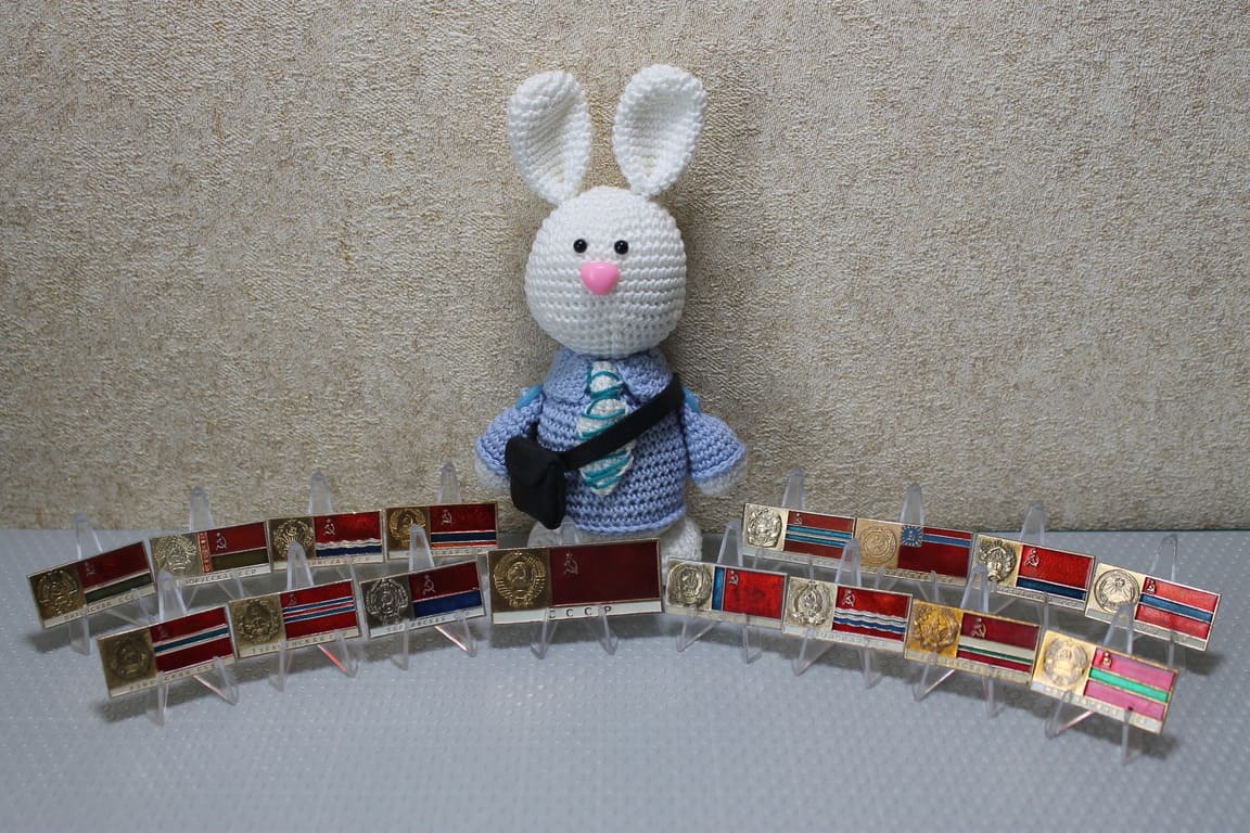 Распаковка бандероли из города Зеленоград Московской области. Часть 5. Полный набор значков «Гербы и флаги союзных республик». Металл - алюминий. Изготовитель - «Мытищинский завод опытных и сувенирных изделий» («МЗСИ»).