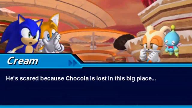 Now that I think about it, I'm not sure if I should put "PREVIEW" on the cutscenes with no voice acting since some cutscenes will probably never have any. Eh, I'll worry about that later. In this cutscene, Sonic and Tails meet up with Cream and Cheese in Sweet Mountain. C wat I did thar? They find CREAM... in SWEET mountain? Eh? Eh? Clever, right? XD. Anyway, as harmless as this cutscene seems, its actually one of... if not THE most important scene in the game, believe it or not.