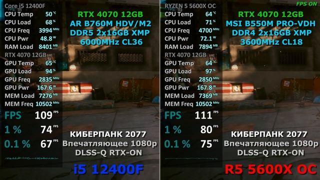 i5 12400F vs RYZEN 5 5600X OC ( RTX 4070 12GB ) в БЕНЧМАРКЕ КИБЕРПАНК 2077 v2.2