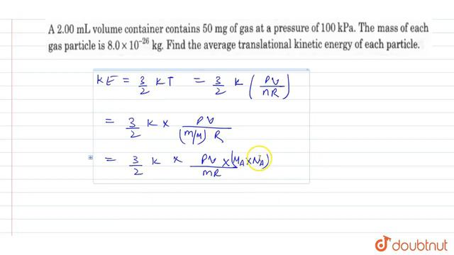Question From – DC Pandey PHYSICS Class 11 Chapter 20 Question – 091 THERMOMETRY,THERMAL EXPANSION & KINETIC THEORY OF GASES CBSE, RBSE, UP, MP, BIHAR BOARD QUESTION TEXT:- A `2.00 mL` volume container contains `50 mg` of gas at a pressure of `100 kPa`. The mass of each gas particle is `8.0 xx 10^-26 kg`. Find the average translational kinetic energy of each particle Doubtnut के साथ १००% मार्क्स पायें, आज ही डाउनलोड करें :- https://doubtnut.app.link/91GzfmKxjP DC Pandey Solutions for Class 11 IIT-JEE and NEET aspirants Doubtnut provides DC Pandey Physics solutions for Class 11 IIT-JEE and NEET aspirants. DC Pandey book series play a vital role in the preparation of Physics for IIT JEE and NEET aspirants. Therefore, solutions of DC Pandey books prove to be helpful while practising the questions from the book. You can start learning with chapter-wise video tutorials of DC Pandey Physics book. DC Pandey Physcis Solutions are arranged chapter-wise and within each chapter, they are arranged by topic-wise. DC Pandey Class 11 Solutions are prepared and reviewed by subject matter experts of IIT cadre. Students will have no doubt left after understanding physics from our DC Pandey solutions. The solutions are detailed in a step by manner for ease in understanding. For more Physics Solutions, visit https://doubtnut.com/physics Score 100% With Doubtnut Prepare your class 11 PHYSICS with our intuitive video solutions and score well in your final academic exam 2019-20. Students can find instant video solutions on our renowned doubt solving app or even on our website by clicking the doubt question from their textbook of class 11 maths, physics, chemistry, biology. The video tutorials are helpful in preparation for the entrance exams like IIT JEE Main and Advanced, and NEET exam. Students can resolve their doubts with self-explanatory video solutions for comprehensive and swift learning. Student can prepare for IIT JEE at https://doubtnut.com/iit-solutions Student can prepare for NEET at https://doubtnut.com/exams/neet Doubtnut app provides free online video solutions that help students to understand each topic and retain what they have learnt for a longer duration. It further helps in creating a stronger foundation for future classes. Subscribe to our YouTube channel to receive notifications of live classes and latest videos on various topics from subjects like – Maths, Physics, Chemistry, Biology etc. for Board & higher studies. Doubtnut ऍप पर आप कक्षा ६ से १२ (IIT JEE तक) के NCERT के गणित/ भौतिक विज्ञान/रसायन विज्ञान/जीव विज्ञान/ के सभी सवालों के वीडियो देखिये और मुफ्त में खोजिये सवाल का जवाब - 5 लाख से भी ज़्यादा सवालों के जवाब हैं Doubtnut ऍप पर You can also ask any question related to Math, Physics, Chemistry, Biology and get a video solution for FREE from a library of more than 5 Lakh Videos Follow Us On Facebook https://www.facebook.com/doubtnut