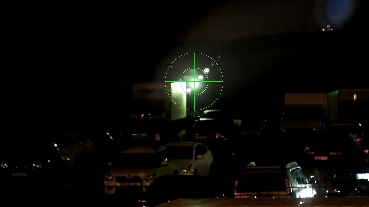 Марка коллиматора наводится на фонарь. Поправки для установки марки на видео Х=50 Y=-115 Расстояние до фонаря примерно 100 м.