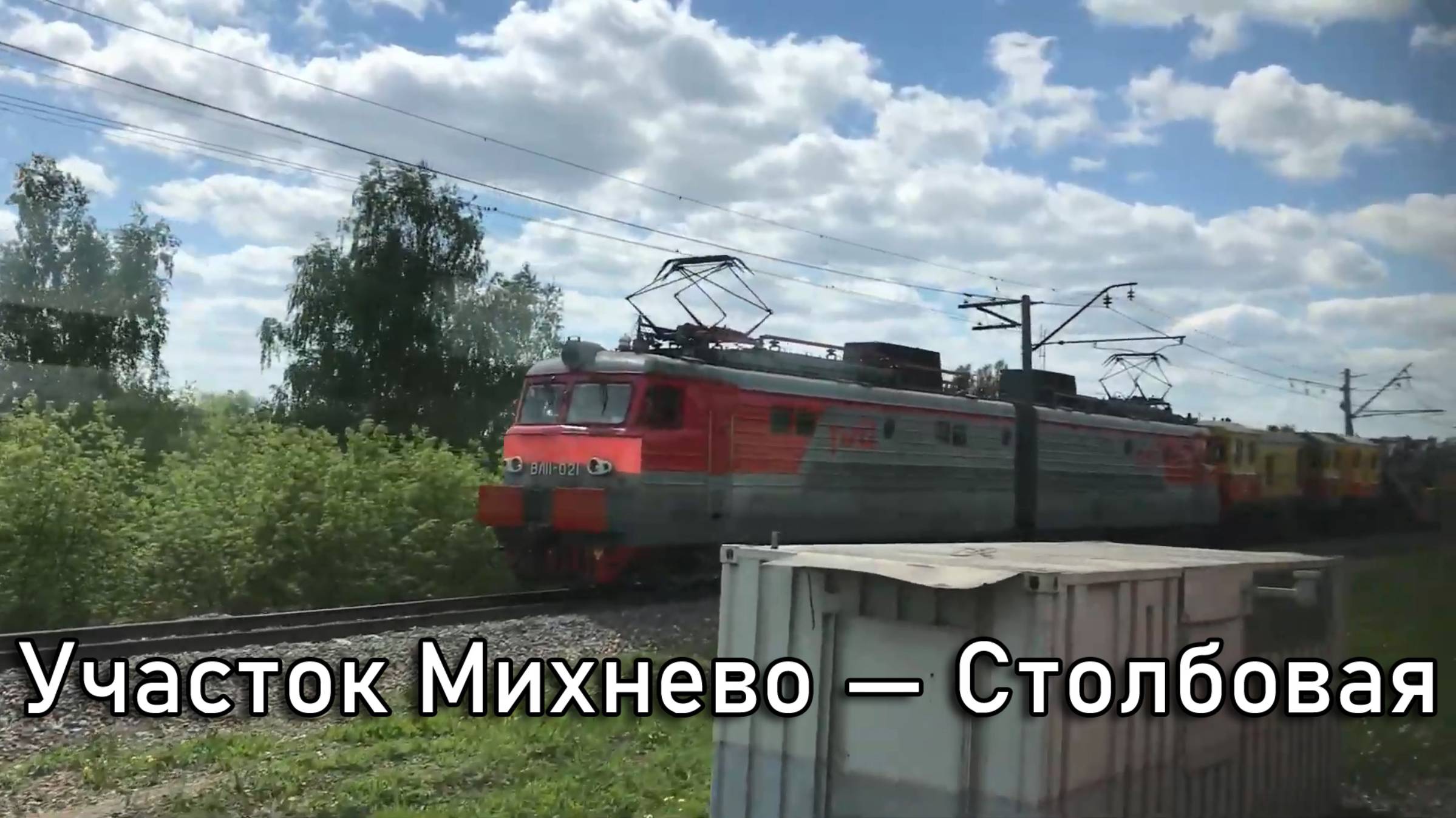0:00 станция Михнево 2:38 Михнево — пост 320 км 4:27 пост 320 км 5:30 Павелецкий ход 5:43 пост 320 км — Усады-Окружные 5:55 Старомихневская улица 6:04 пост 320 км — Усады-Окружные 6:48 Каширское шоссе 6:53 пост 320 км — Усады-Окружные 6:58 автодорога М-4 "Дон" 7:05 пост 320 км — Усады-Окружные 8:00 станция Усады-Окружные 9:45 остановка Усады-Окружные 10:54 станция Усады-Окружные 12:02 Усады-Окружные — 312 км 14:49 остановка 312 км 15:25 312 км — 309 км 18:50 остановка 309 км 19:27 309 км — Повадино 21:18 разобранная станция Повадино 22:29 остановка Повадино 23:22 разобранная станция Повадино 24:31 Повадино — 298 км 29:59 остановка 298 км 30:40 298 км — 294 км 31:23 неработающие светофоры 31:46 298 км — 294 км 34:48 294 км без остановки 34:54 294 км — Детково 35:53 автодорога А-112 Чепелево-Вельяминово 36:00 294 км — Детково 39:10 Симферопольское шоссе 39:24 294 км — Детково 40:05 станция Детково 42:41 остановка Детково