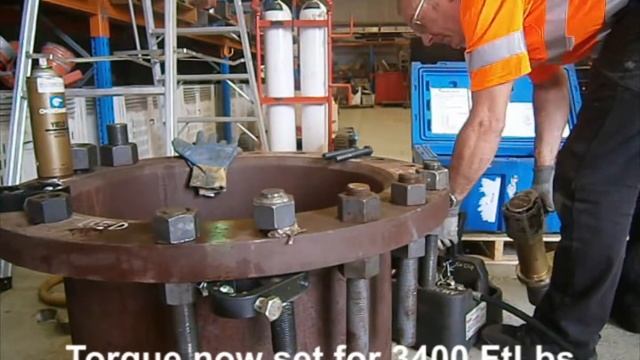 The Duet Safety Backup magnetic wrench being tested for breaking point. A flange with 1-1/4" studs is our test bench. The stud has two nuts welded on to the bolt, so all the torque is taken through the Duet Backup Wrench. The Duet release bolt pushes against the adjacent stud nut as the reaction point while a RAD Pneumatic Torque Wrench applies a set amount of torque. The Torque is first set to 2,500 FtLbs. Both the Duet and the stud hold OK. The RAD is then set to its maximum of 3,400 FtLbs torque. This torque is well in excess of the rating for a 1-1/4" stud. The torque is applied and the Stud shears off, leaving the Duet unharmed. An excellent result proving the inherent strength of the Duet Magnetic Safety Backup wrench.