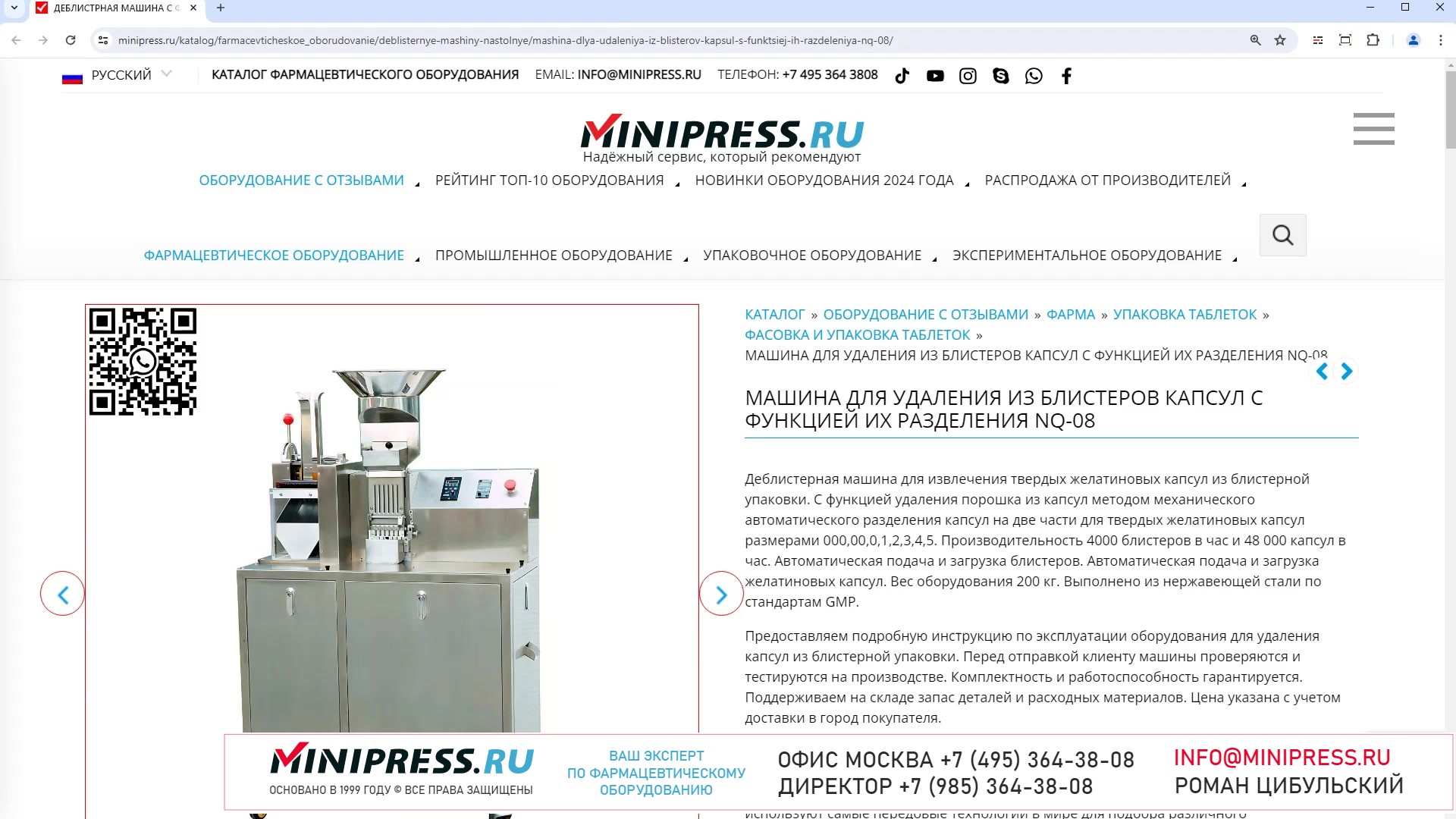 Компания MINIPRESS.RU занимается подбором и поставкой лабораторного аналитического оборудования для фармацевтических лабораторий, а именно Анализаторов Влажности,Плавления, Прозрачности, Распадаемости, Растворения, Анализаторов Состава, Таяния, Твердости, Толщины, Тягучести, и контроля качества лекарственных средств. Компания Романа Цибульского MINIPRESS.RU занимается поставкой большого ассортимента фармацевтического оборудования из Китая, Кореи, Индии, Европы и других стран. Мы выполняем работы по поиску, подбору, закупке, доставке, и таможенной очистке оборудования с доставкой в любой город России и стран СНГ. Основатель и ведущий специалист компании - Роман Цибульский. Компания MINIPRESS.RU (зарегистрированный товарный знак) основана в 2000 году. Онлайн каталог оборудования MINIPRESS.RU ежедневно посещают несколько тысяч человек. Мы развиваем крупные каналы в социальных сетях, посвященные тематике фармацевтического оборудования. Вы можете посмотреть видео ролики об оборудовании, которым мы занимаемся. Фактически у нас самый большой в России многоязычный каталог фармацевтического оборудования с фотографиями, описаниями, и что более важно с ценами и видео демонстрацией оборудования в работе. Подбор оборудования и консультации ведет сам владелец компании - Роман Цибульский. Компания имеет огромный опыт в работе с различным оборудованием, технологиями. Помогаем клиентам выбрать модель фармацевтического оборудования, которое сможет решить поставленную задачу. Наши специалисты помогают рекомендациями в решении проблем по эксплуатации оборудования. Наша компания имеет офис в г.Шанхай и несколько менеджеров, которые помогают в работе с китайскими поставщиками. Мы долго сотрудничаем и дружим с этими специалистами. Китайские поставщики ценят нас как постоянных партнеров. Роман Цибульский Директор компании Минипресс Поставка фармацевтического оборудования в Россию Пишите: info@minipress.ru Gmail: boss.minipress@gmail.com Офис в Москве +7(495)364-38-08 Мобильный +7(985)364-38-08 (WhatsApp) Каталог оборудования https://www.Minipress.ru/katalog/ МИНИПРЕСС.РУ В СОЦИАЛЬНЫХ СЕТЯХ FB https://facebook.com/roman.tsibulsky YOUTUBE https://www.youtube.com/@farmacevticheskoe_oborudovanie INSTAGRAM https://www.instagram.com/farmacevticheskoe_oborudovanie/ #материал #технологии #производство #эмульгатор #порошок #таблетка #таблетпресс #стик #инвестиции #мельница