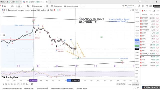 Как обсуждали ранее (https://youtu.be/f8gCDYypBs0), разворота по паре USD/RUB, CNY/RUB пока не стоит ожидать, нисходящая структура по активам не завершена. Более того, нисходящая свеча по фьючерсу на USD/RUB, по моему мнению, является ориентиром по целям для дальнейшего укрепления рубля против доллара. Больше разметок в открытом ТГ канале: t.me/a_belkina_invest Подписка на Закрытый канал и Еженедельные созвоны: https://t.me/MarketViewBot Сайт: https://a-belkina-invest.ru/ Сертификаты: CFA и MCSI (от британского института CISI); ФСФР 1.0 и ФСФР 5.0. Инвестиционный Советник, запись № 232 в реестре ЦБ РФ. Контент имеет информативный характер и не является инвестиционной рекомендацией.