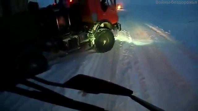 Самостоятельно выехал КамАЗ с груженым прицепом, когда съехал в зимний овраг.