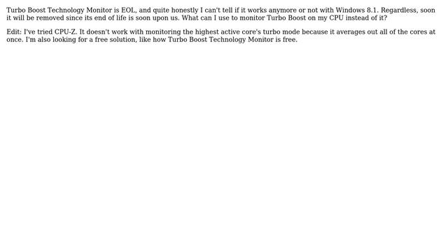 Turbo Boost Technology Monitor is EOL so what can I use to monitor Turbo Boost on my CPU? Helpful? Please support me on Patreon: https://www.patreon.com/roelvandepaar With thanks & praise to God, and with thanks to the many people who have made this project possible! | Content (except music & images) licensed under CC BY-SA https://meta.stackexchange.com/help/licensing | Music: https://www.bensound.com/licensing | Images: https://stocksnap.io/license & others | With thanks to user Hennes (superuser.com/users/121352), user Alexandru (superuser.com/users/167722), and the Stack Exchange Network (superuser.com/questions/744104). Trademarks are property of their respective owners. Disclaimer: All information is provided "AS IS" without warranty of any kind. You are responsible for your own actions. Please contact me if anything is amiss at Roel D.OT VandePaar A.T gmail.com