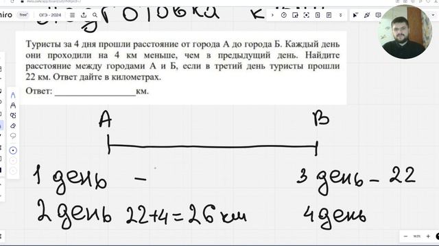 Записаться на занятия по номеру: 8-902-404-84-81 Моя группа в VK - https://vk.com/andreymath Телеграм - https://t.me/ quyp7TDDp7liNWMy Туристы за 4 дня прошли расстояние от города А до города б каждый день и не проходили на 4 км меньше чем в предыдущий день Найдите расстояние между городами А и Б если в третий день туристы прошли 22 км Ответ дайте в километр