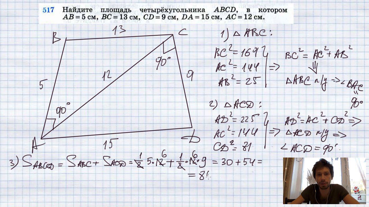 №517. Найдите площадь четырехугольника ABCD, в котором АВ = 5 см, ВС = 13 см, CD = 9 см, DA =15 см, АС = 12 см. Мой второй канал для подготовки к ЕГЭ и ОГЭ - https://www.youtube.com/ЕвгенийСумин TikTok - https://vm.tiktok.com/WJJwK9 Like - https://likee.com/user/@ge0metriya Инстаграм - https://www.instagram.com/EGE_OGE.math Личный инстаграм - https://www.instagram.com/ee_sumin VK - https://vk.com/evgeniysumin FB - https://www.facebook.com/EvgeniySumin