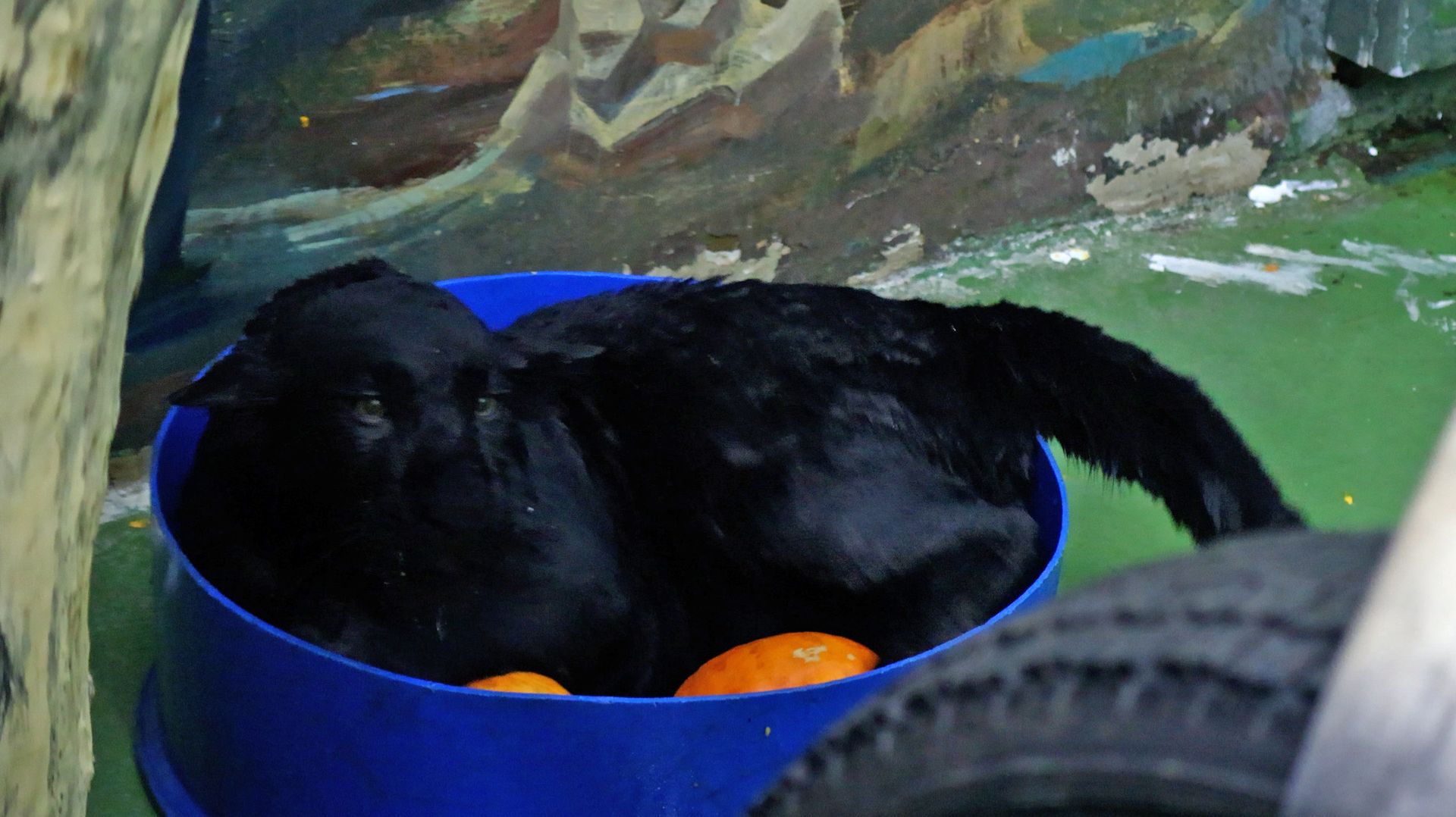 Чёрный ягуар Габриэль купается в "бассейне"..
