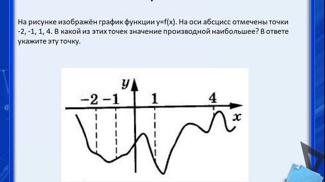 Типовые экзаменационные варианты по математике ЕГЭ (профиль) из сборника под редакцией И.В. Ященко 36 вариантов 12 вариант 1 часть В тупоугольном треугольнике АВС известно, то АС=ВС, высота АН равна 3, СН= √7. Найдите синус угла АСВ. Цилиндр вписан в правильную шестиугольную призму. Радиус основания цилиндра равен √3, а высота равна2. Найдите площадь боковой поверхности призмы. На экзамене по геометрии школьник отвечает на один вопрос из списка экзаменационных вопросов. Вероятность того, что это вопрос по теме «Вписанная окружность», равна 0,25. Вероятность того, что это вопрос по теме «Площадь», равна 0,3. Вопросов, которые одновременно относятся к этим двум темам, нет. Найдите вероятность того, что на экзамене школьнику достанется вопрос по одной из этих двух тем. Две фабрики выпускают одинаковые стекла для автомобильных фар. Первая фабрика выпускает 25% этих стекол, вторая — 75%, причём брак стёкол, изготовленных фабриками, составляет на первой фабрике 5%, на второй - 1%. Найдите вероятность того, что случайно купленное в магазине стекло окажется бракованным. На рисунке изображён график функции y=f(x). На оси абсцисс отмечены точки -2, -1, 1, 4. В какой из этих точек значение производной наибольшее? В ответе укажите эту точку. При температуре 0 °С рельс имеет длину l0 = 15м. При возрастании температуры происходит тепловое расширение рельса, и его длина, выраженная в метрах, меняется по закону l(t°)= l0(1+?∙t°) , где ?=1,2∙10 -5 (°С) -1 — коэффициент теплового расширения, t° — температура (в градусах Цельсия). При какой температуре рельс удлинится на 7,2 мм? Ответ дайте в градусах Цельсия Велосипедист выехал с постоянной скоростью из города А в город В, расстояние между которыми равно 135 км. На следующий день он отправился обратно со скоростью на 9 км/ч больше прежней. По дороге он сделал остановку на 4 часа. В результате он затратил на обратный путь столько же времени, сколько на путь из А в В. Найдите скорость велосипедиста на пути из В в А. Ответ дайте в км/ч. На рисунке изображен график функции f(x)=ах2+bх+c. Найдите f(-9).